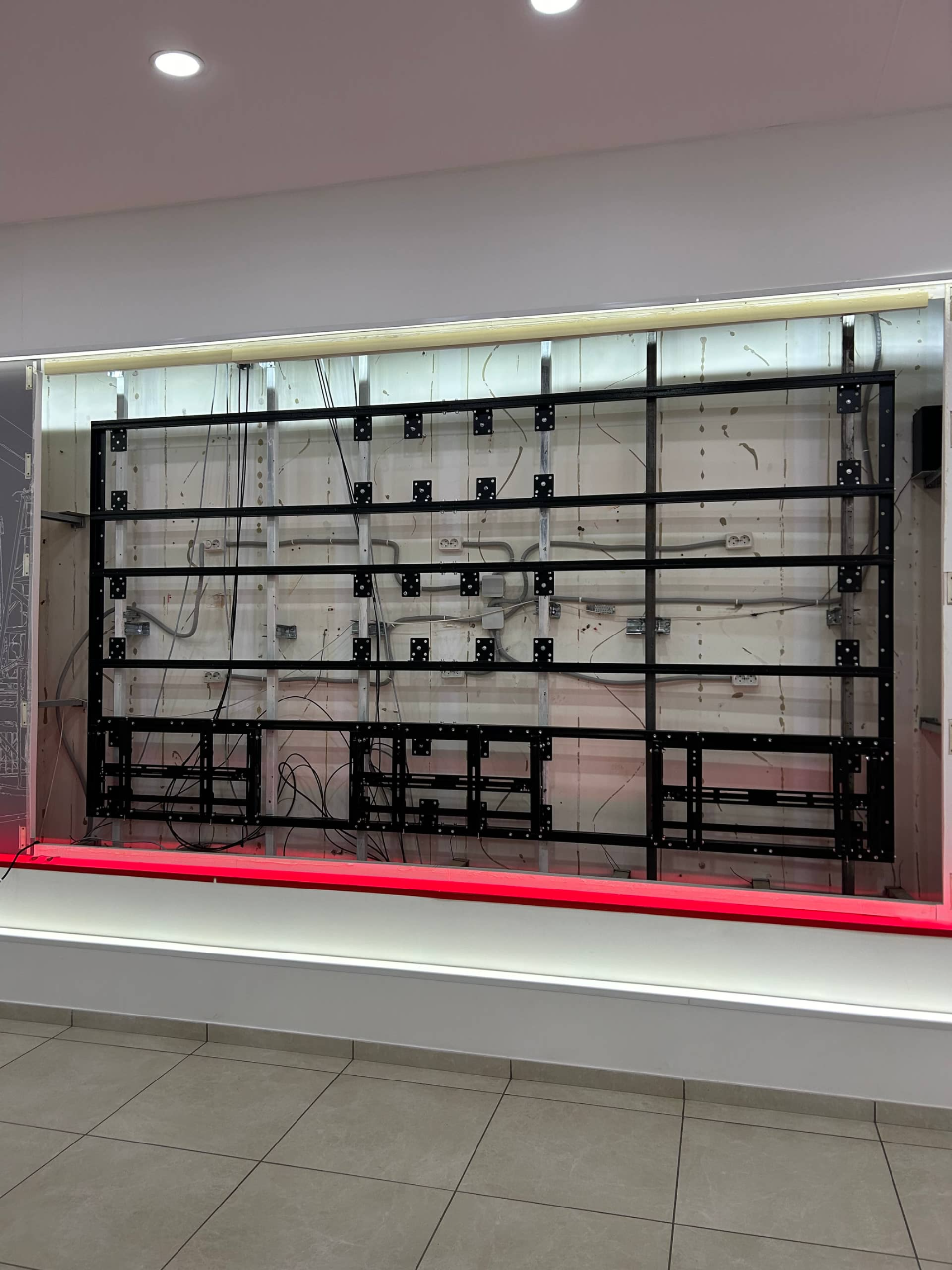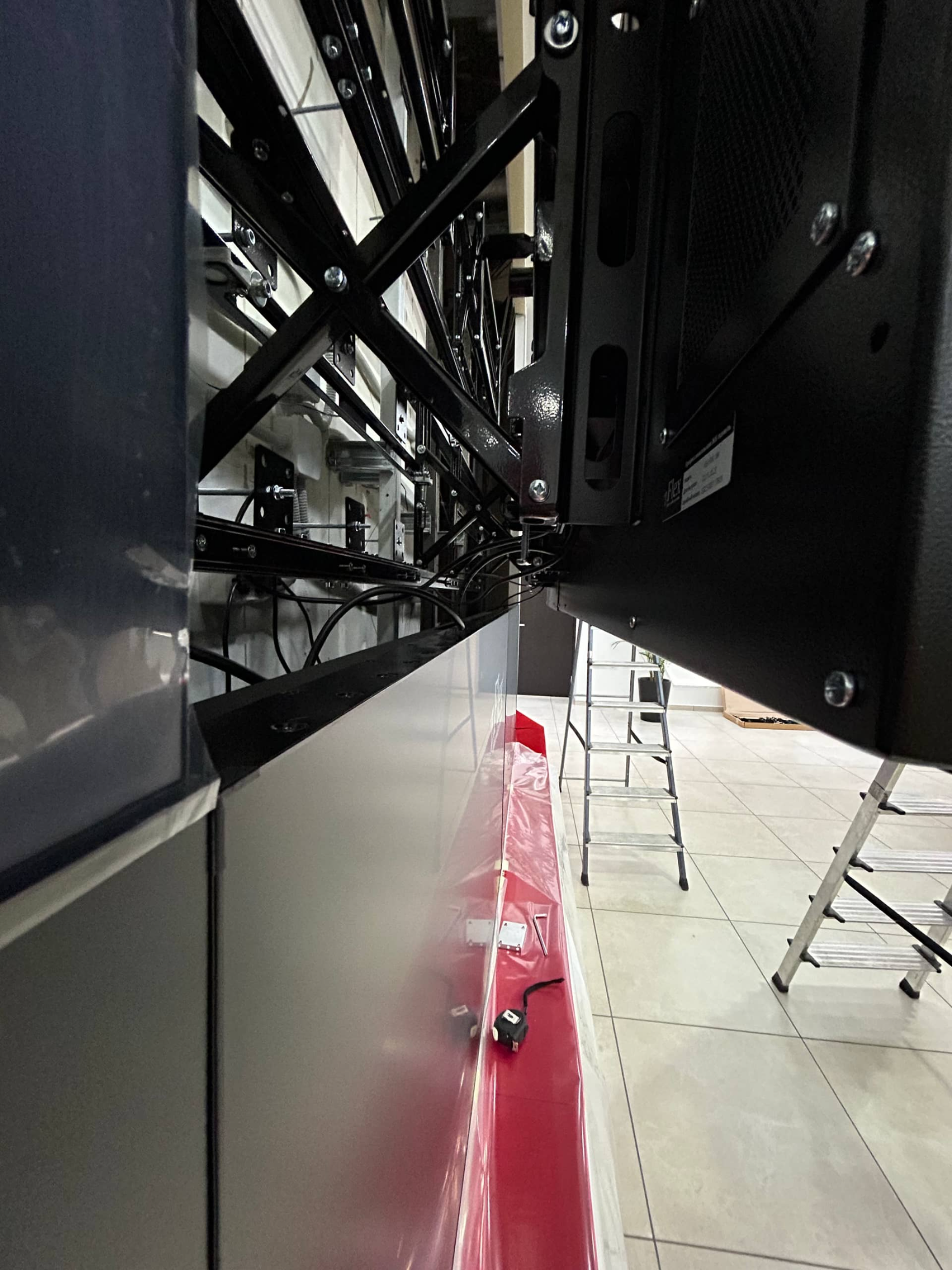 - Видеостена установлена на специализированном кронштейне типа "push-in/push-out", каждый дисплей можно выдвинуть отдельно, что заметно упрощает процесс обслуживания.
