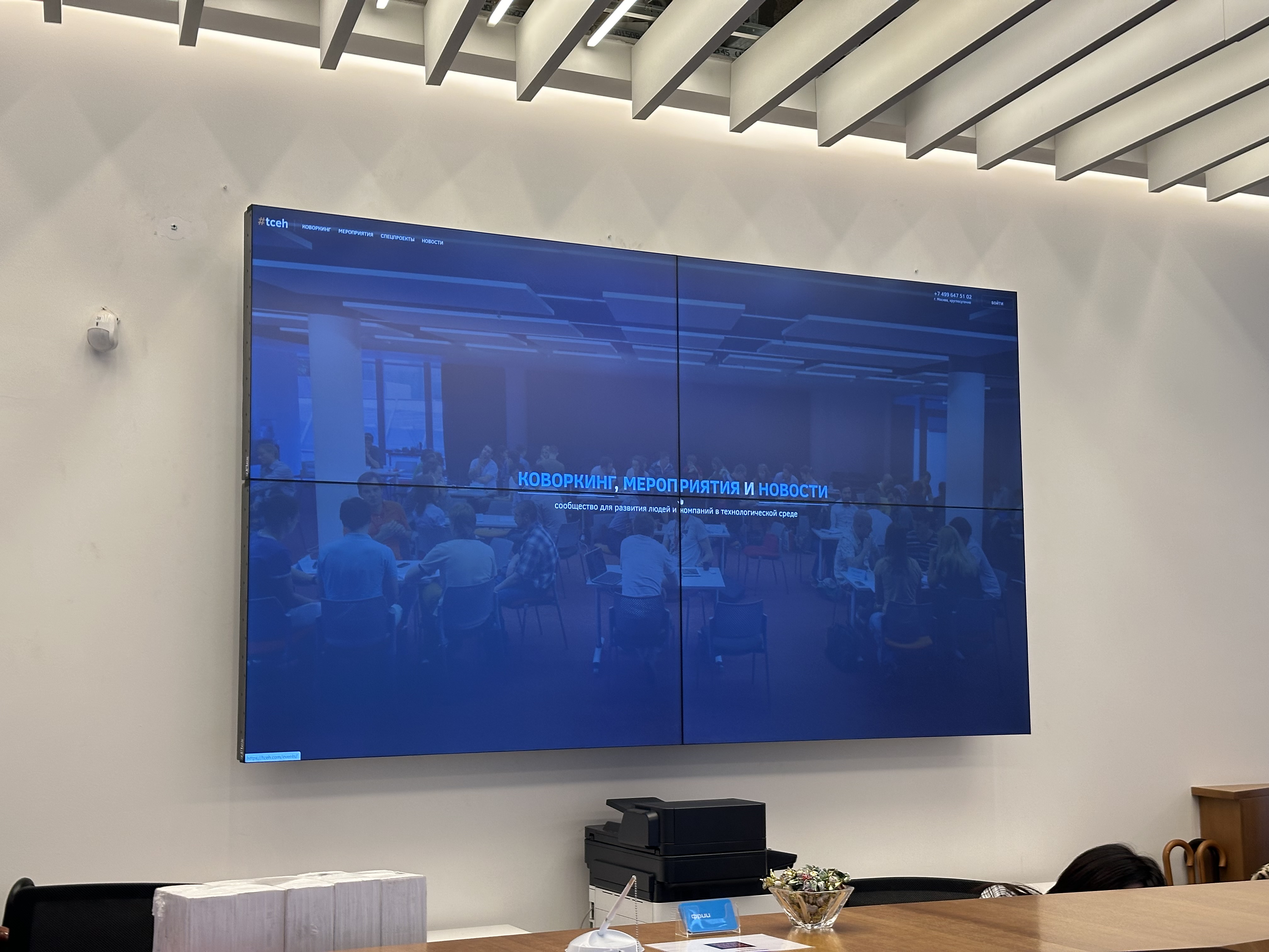 Компания "Агентство креативных мультимедийных технологий" для компании "1000 Дюймов" провели модернизацию видеостены 2х2 из бесшовных LCD-панелей 55" во входной зоне Фонда Развития Интернет Инициатив.
