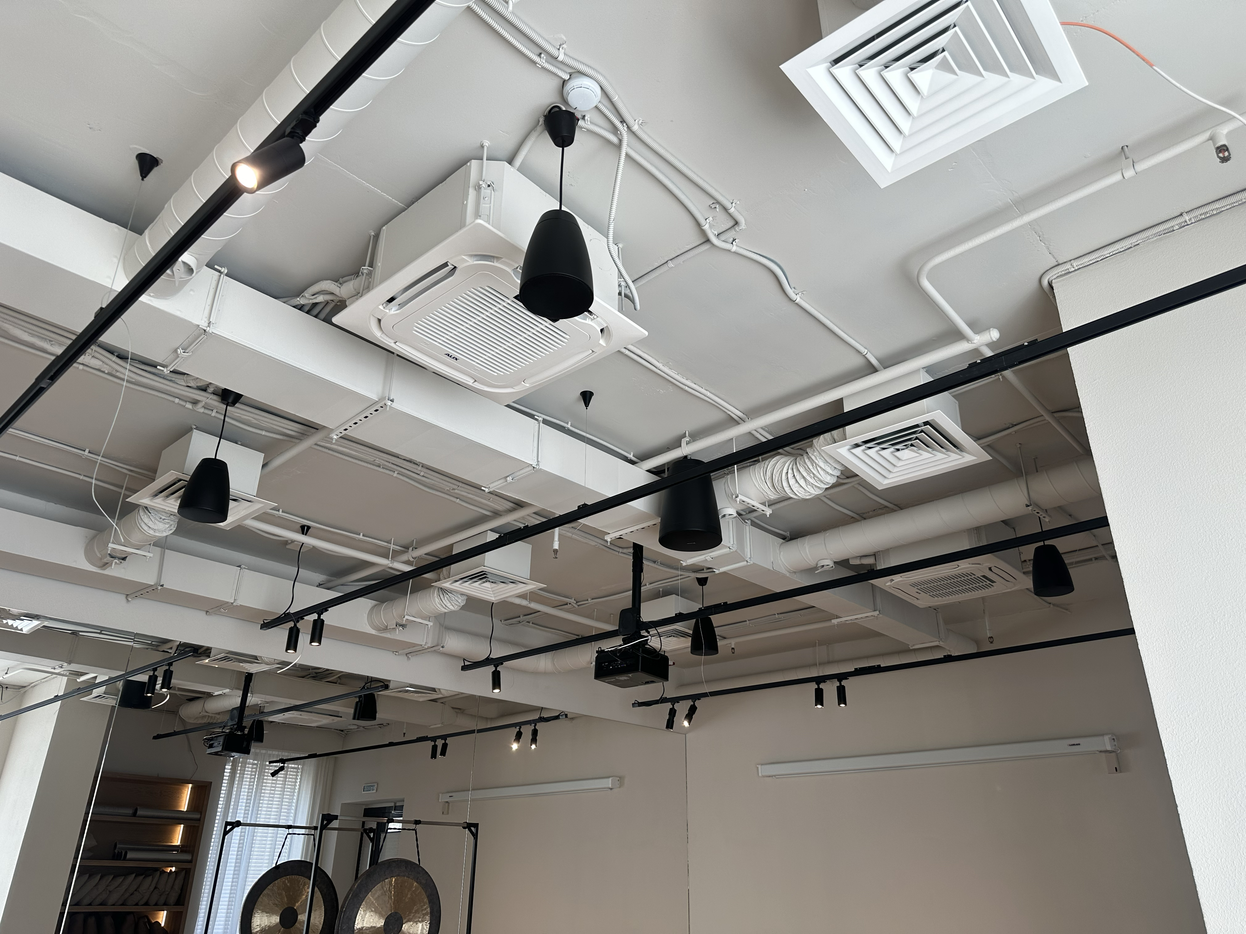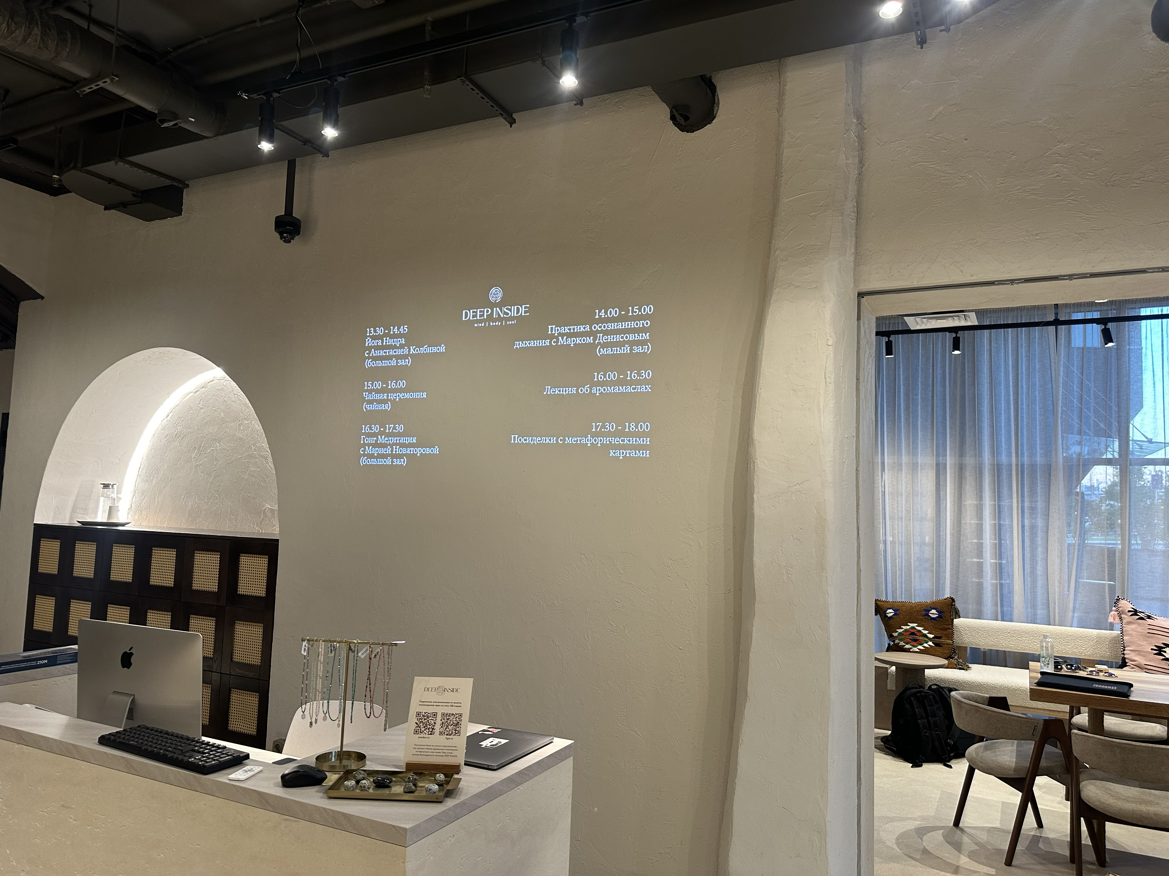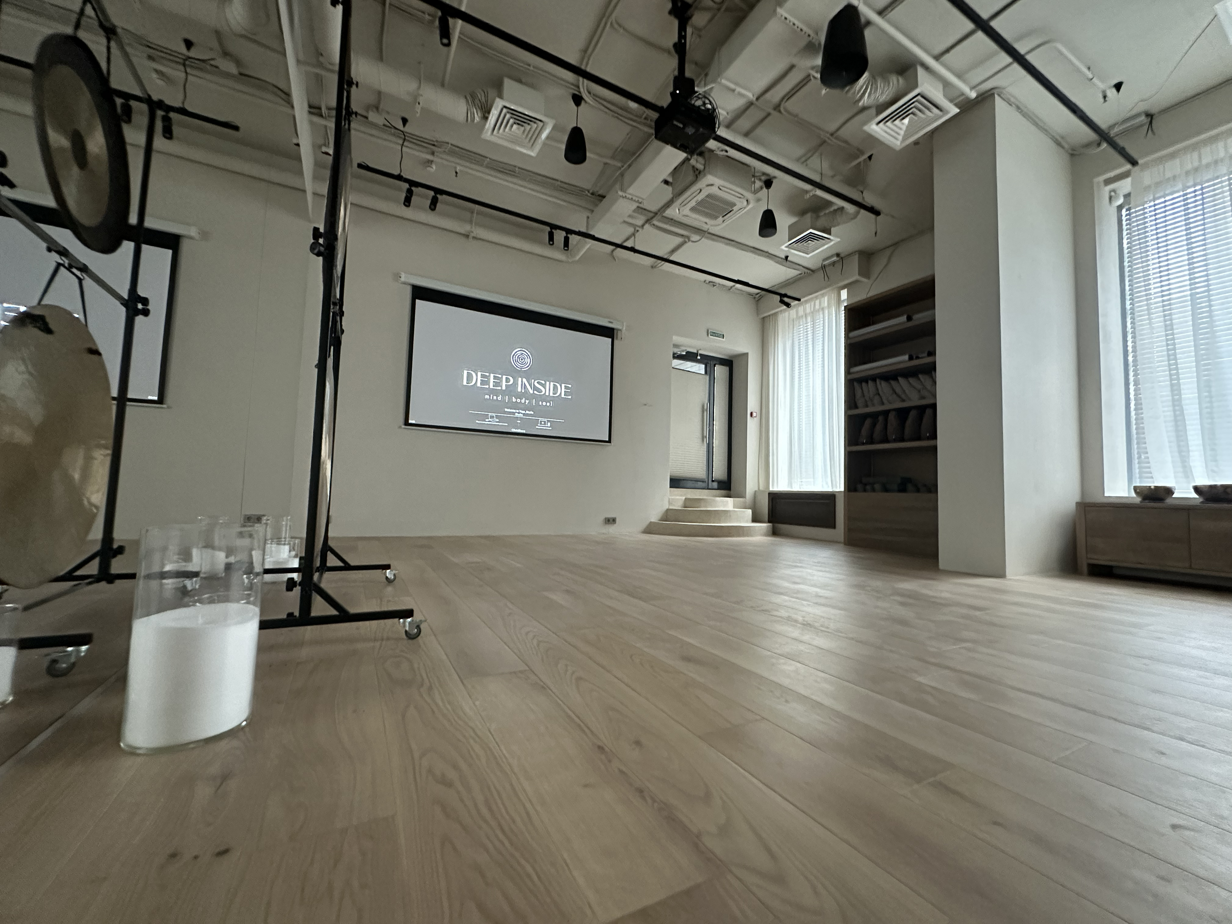 Мультимедийный комплекс включает в себя все необходимое для проведения различных занятий, семинаров и практик. Были оснащены различные помещения для приёма гостей пространства, такие как: чайная, welcome-зона, студия для занятий йогой, раздевалки и т.д.