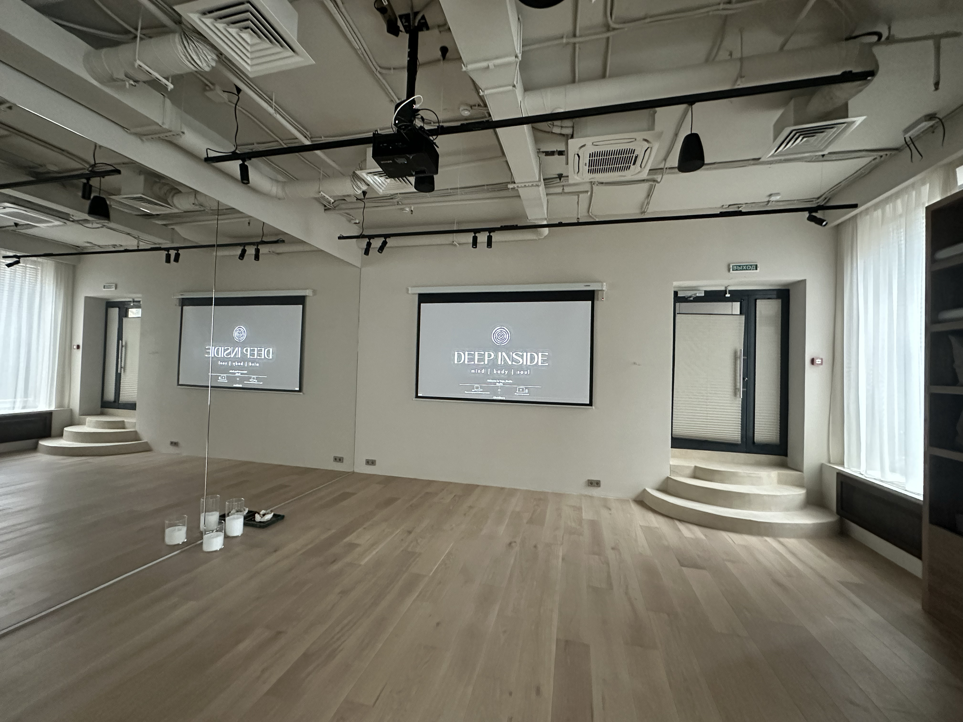 - Проектор с проекционным экраном в студии для занятий йогой. Контент выводится при помощи беспроводного подключения(Airplay, Miracast)