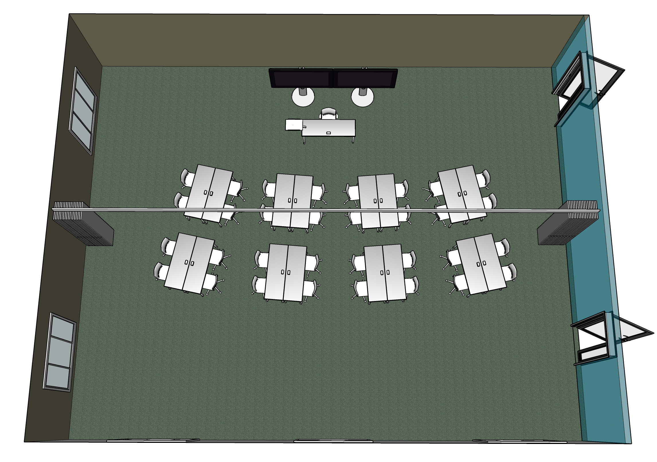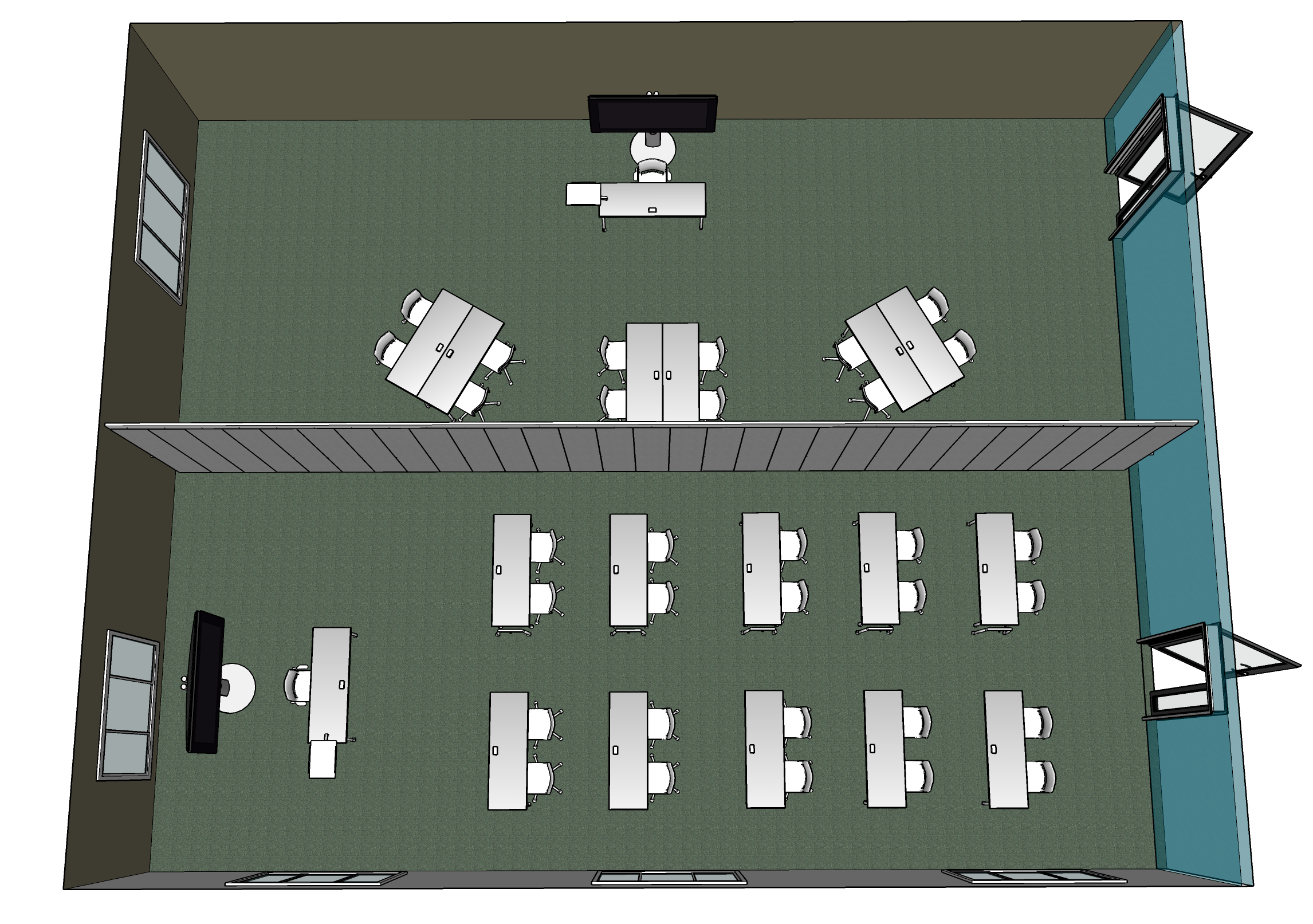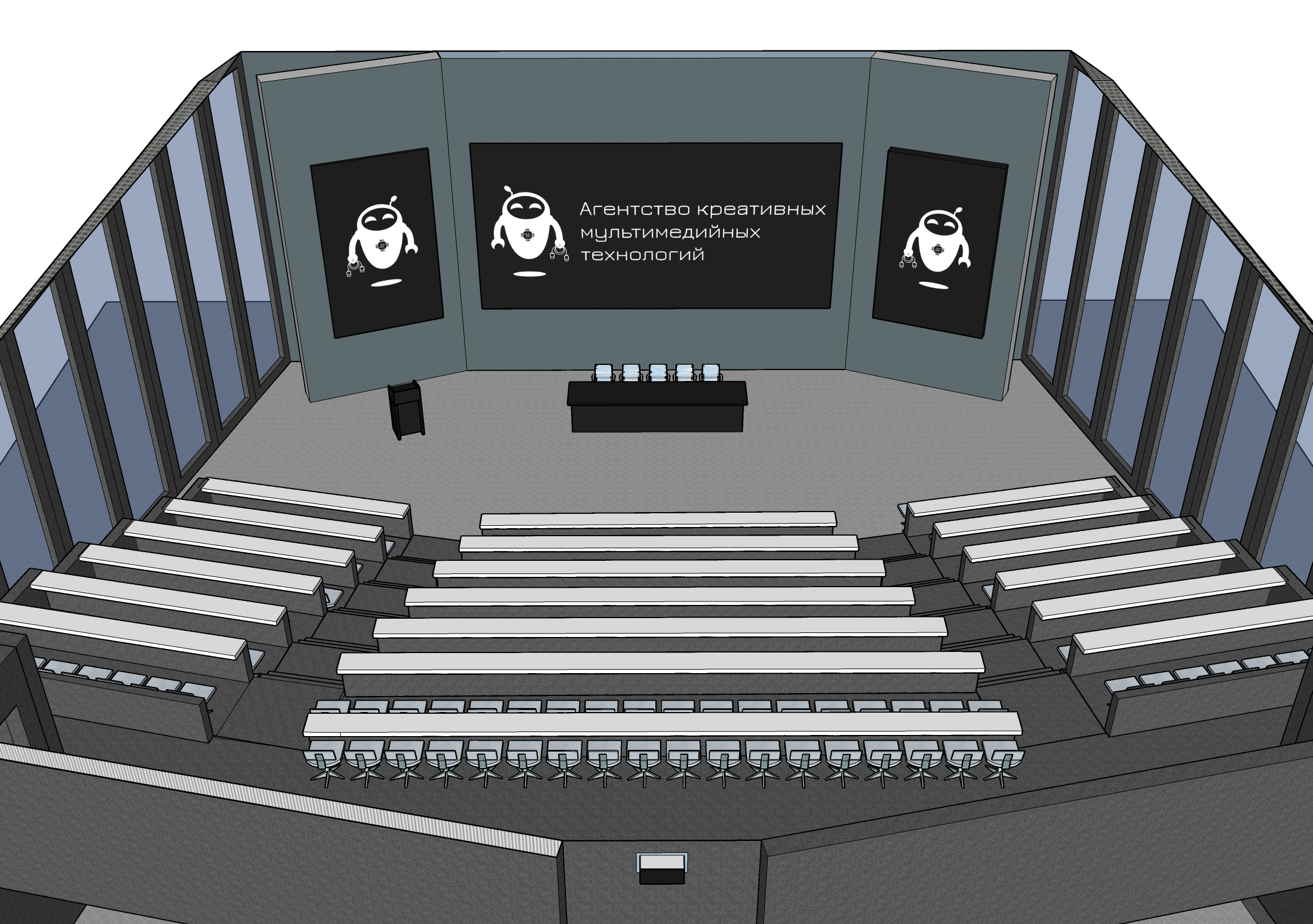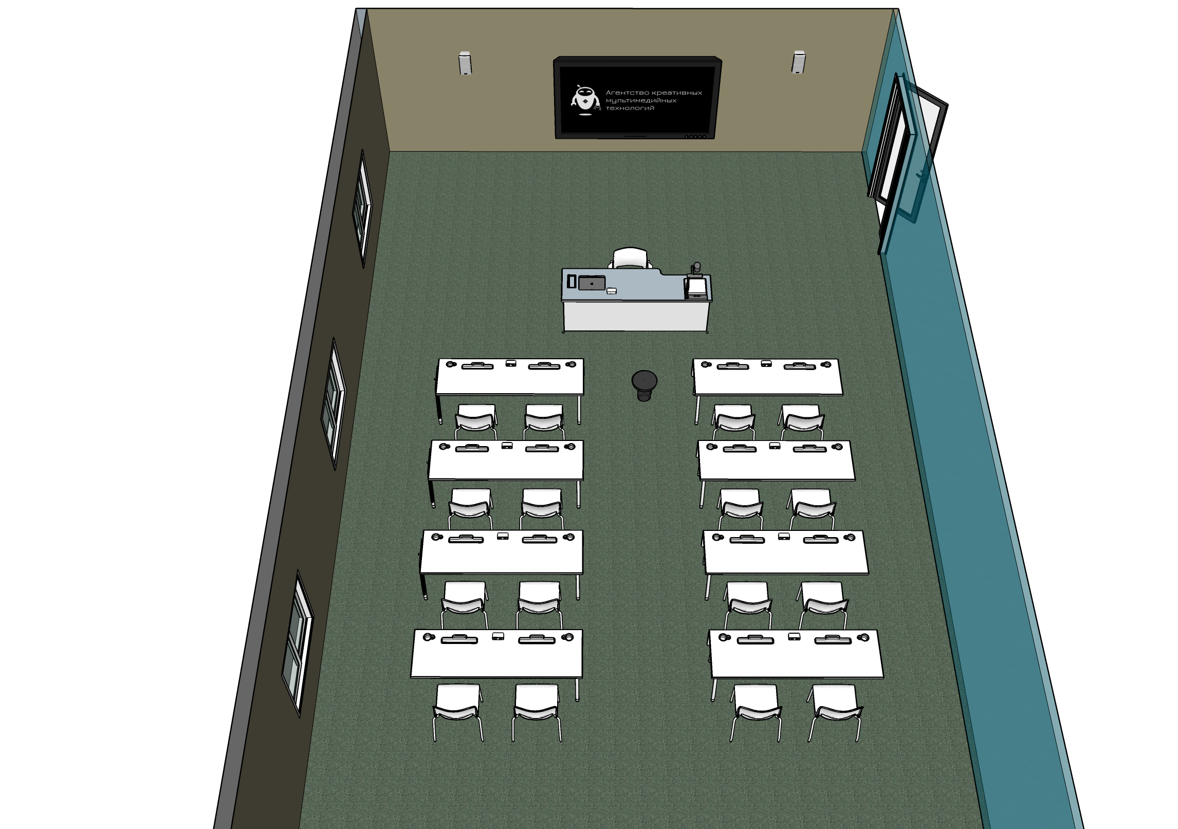 Оснащен всем необходимым: - Персональный ПК или ноутбук - Документ-камера для показа печатной информации - Врезной коммутационный лючок для подключения различных источников